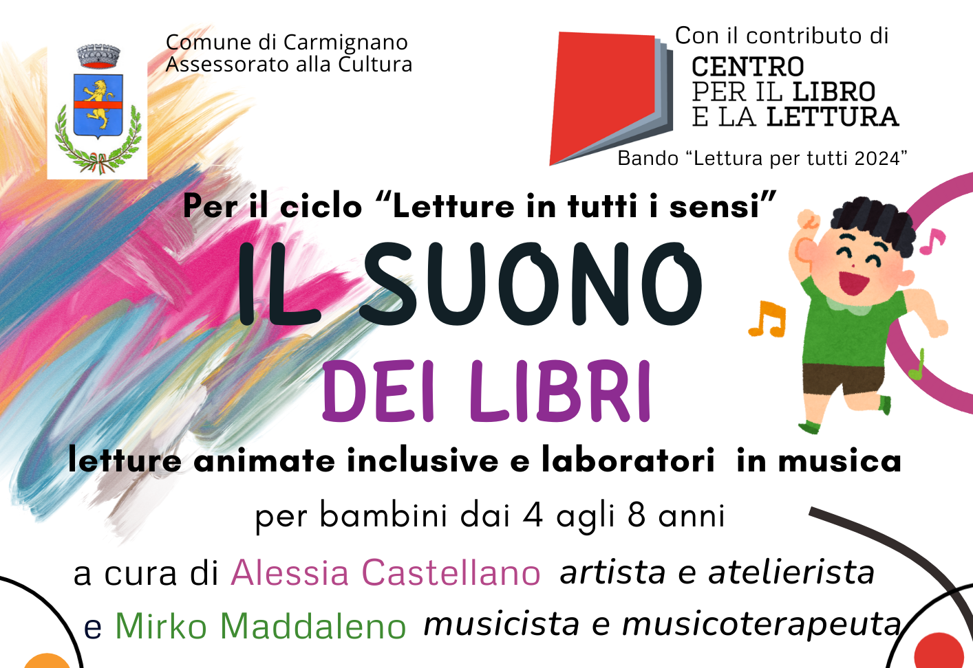 Il Comune di Carmignano – Assessorato alla Cultura, con il contributo del Centro per il Libro e la Lettura (Bando “Lettura per tutti 2024”), presenta “Il Suono dei Libri”, ciclo di incontri del progetto Letture in tutti i sensi dedicato a bambine e bambini dai 4 agli 8 anni.
