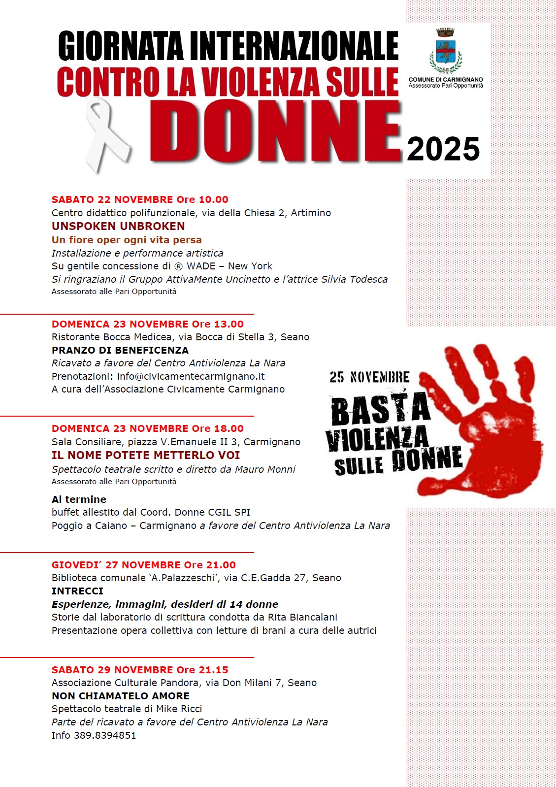 E' necessario non abbassare mai la guardia e non stancarsi a sensibilizzare l’opinione pubblica su questo tragico problema attraverso azioni mirate, iniziative, incontri, eventi, testimonianze, libri ecc. ecc. A tal fine l’Assessorato alle Pari Opportunità del Comune di Carmignano si adopera sempre nello stilare un programma di iniziative che abbraccia anche quelle proposte dall'associazionismo locale. Il programma 2025 prevede numerosi appuntamenti, alcuni di essi finalizzati a sostenere il Centro antiviolenza La Nara di Prato. Fra di essi spiccano il progetto statunitense “Unspoken Unbroken” ceduto dalla Wade di New York e uno spettacolo teatrale che nel 2021 ha debuttato contemporaneamente in 50 italiane.