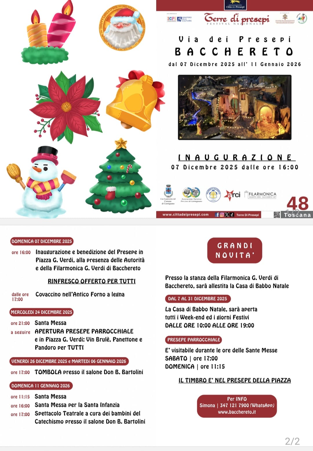 Dal 7/12/2025 all’11/1/2026 per il 4° anno consecutivo Bacchereto si arricchisce interamente di espressioni di arte presepiale. Più di 40 presepi tutti da ammirare lungo una passeggiata che toccherà giardini ed esterni di altrettante abitazioni. La Via dei Presepi di Bacchereto aderisce dal 2022 all’Associazione Nazionale “Città dei Presepi”